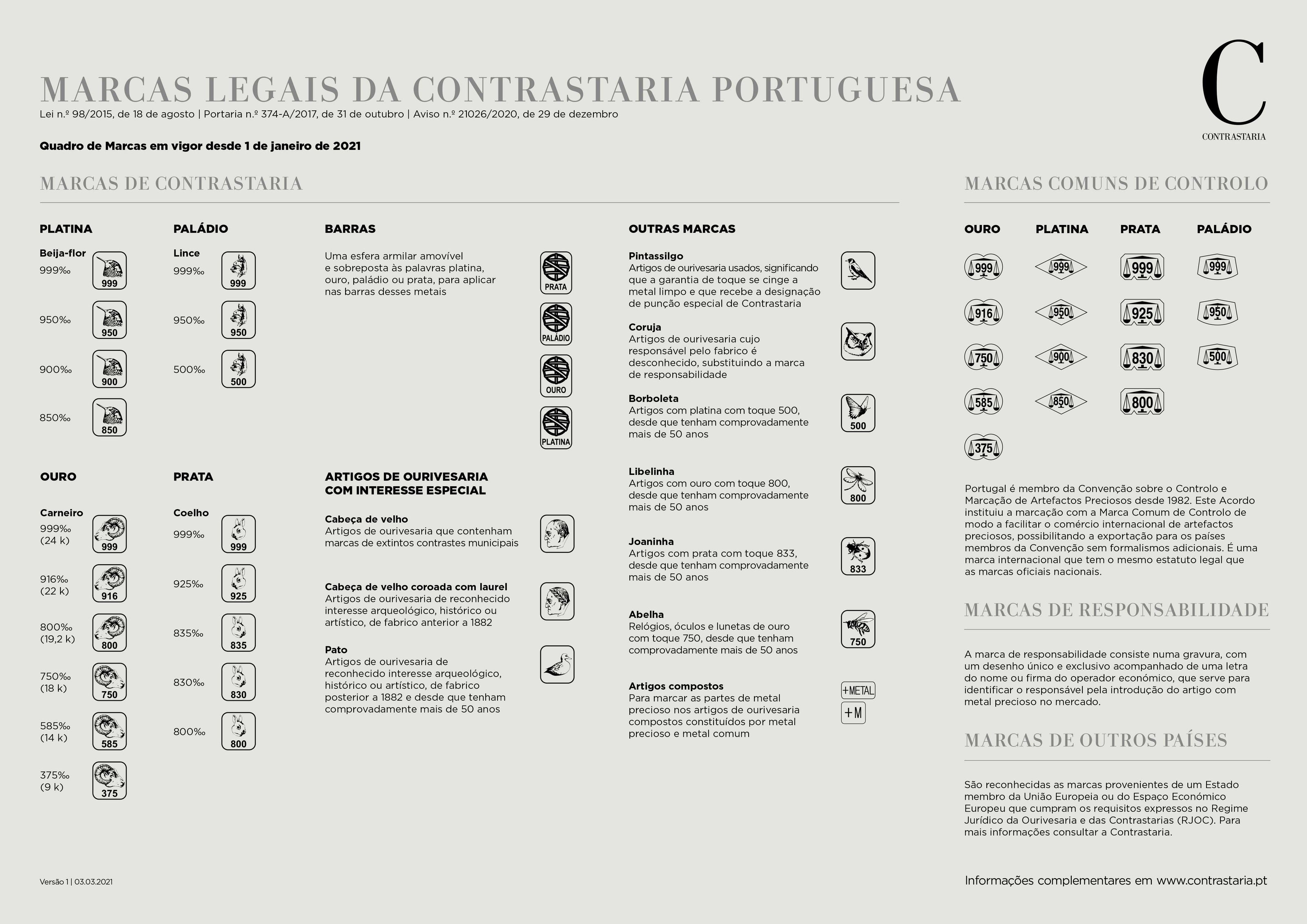 Todos os artigos produzidos com metais preciosos são submetidos a uma certificação legal, através da gravação de uma marca, pela Contrastaria da Imprensa Nacional da Casa da Moeda – MARCAS INCM